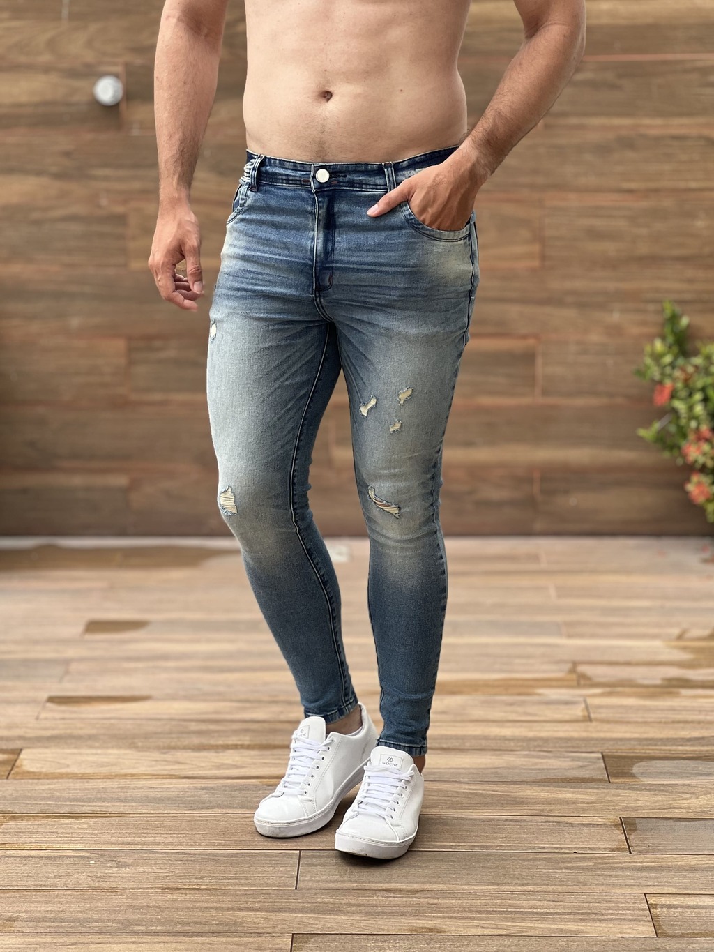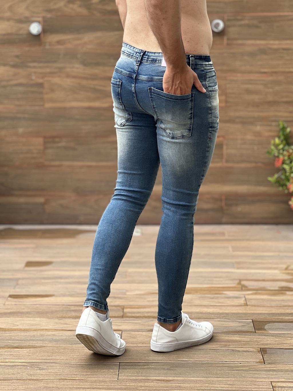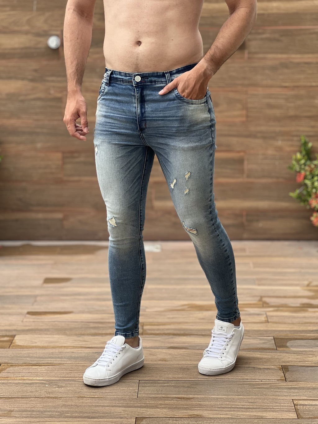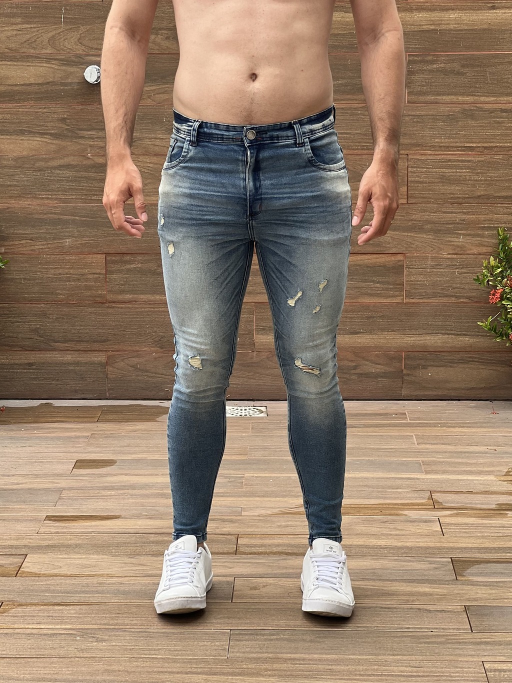 Calça jeans de modelagem skinny, tecido de alta elasticidade, e lavagem com detonado bem localizados para da aquele estilo.